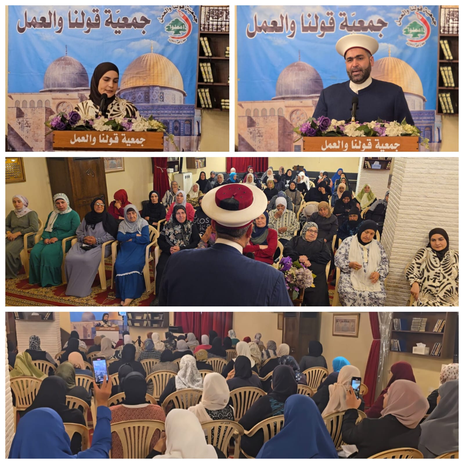 كما وكانت كلمة لرئيسة الهيئة النسائية في جمعية قولنا والعمل المهندسة منال القطان قالت فيها  ” نحن من هنا من جمعية قولنا والعمل، نعلن تضامننا معكم يا نساء وشيوخ ورجال وأطفال غزة، ونقول للنساء خاصة في غزة هاشم نحن نتعلم منكن الصبر والثبات على الحق، وإن شاء الله تعالى نصركم آت لا محال، وإن أبناءكم المجاهدين سيسطرون انتصارا لكل الأمة بدحر العدو وانهزامه أمام صبركم وجهادكم، ونصر من الله لكم ” .