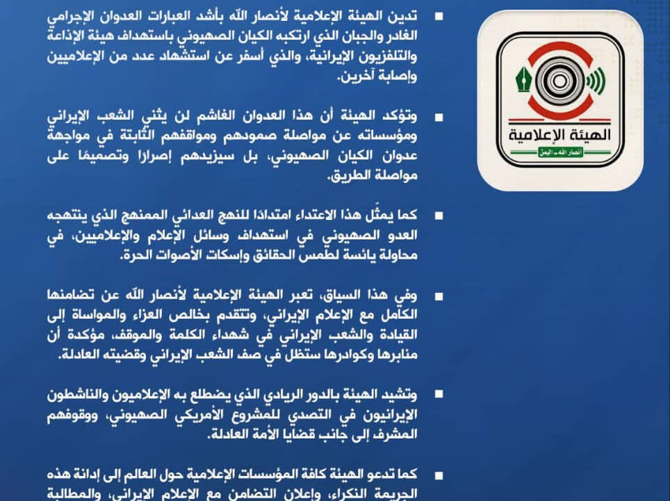 أدانت الهيئة الإعلامية لأنصار الله بأشد العبارات، العدوان الإجرامي الغادر والجبان الذي ارتكبه الكيان الصهيوني باستهداف هيئة الإذاعة والتلفزيون الإيرانية، والذي أسفر عن استشهاد عدد من…